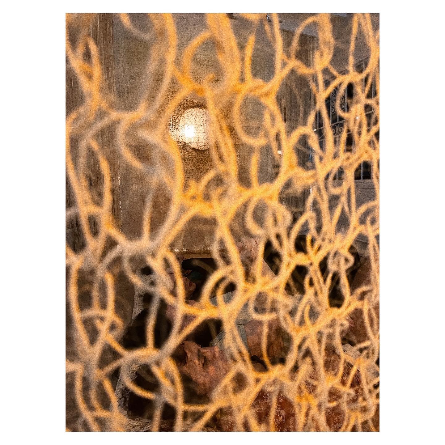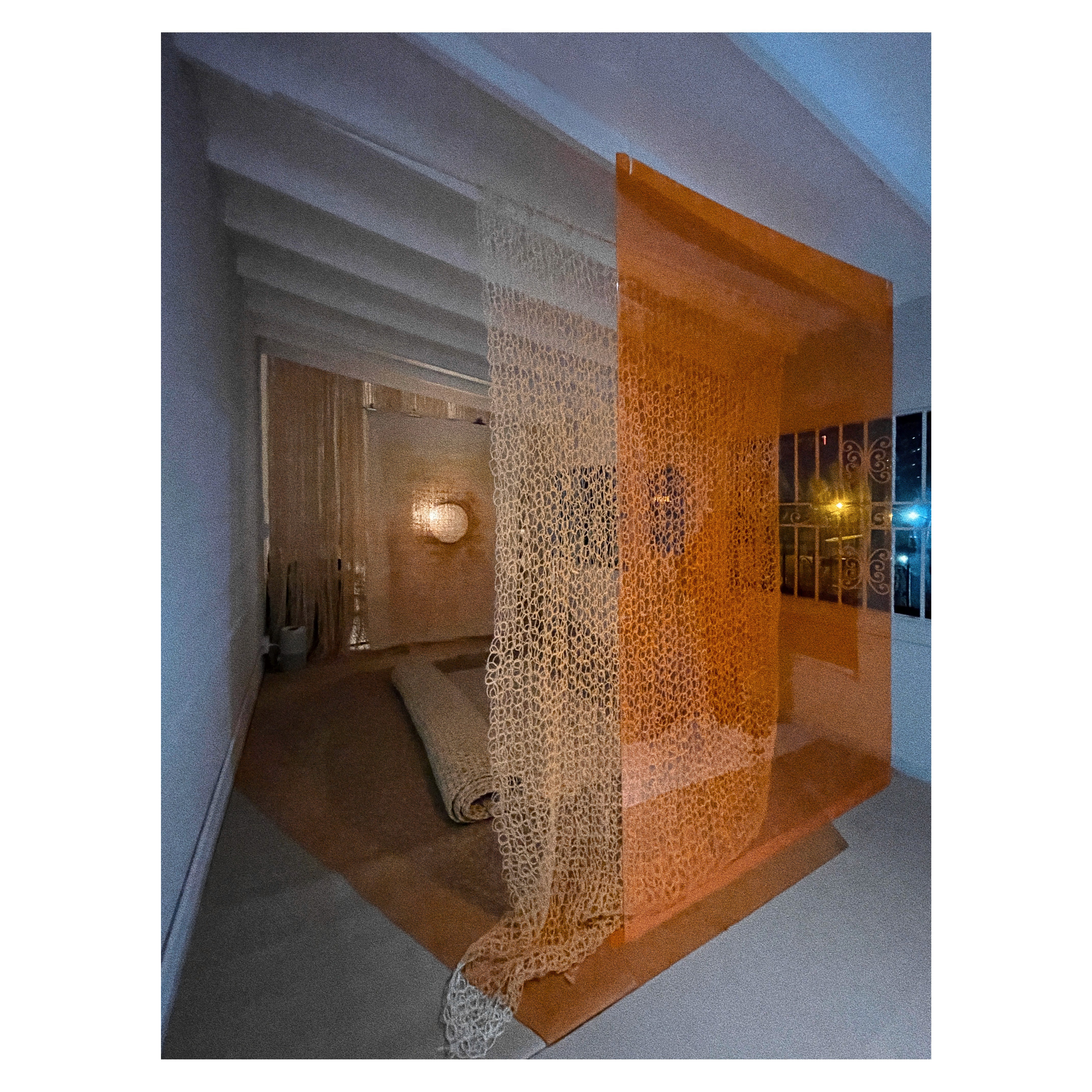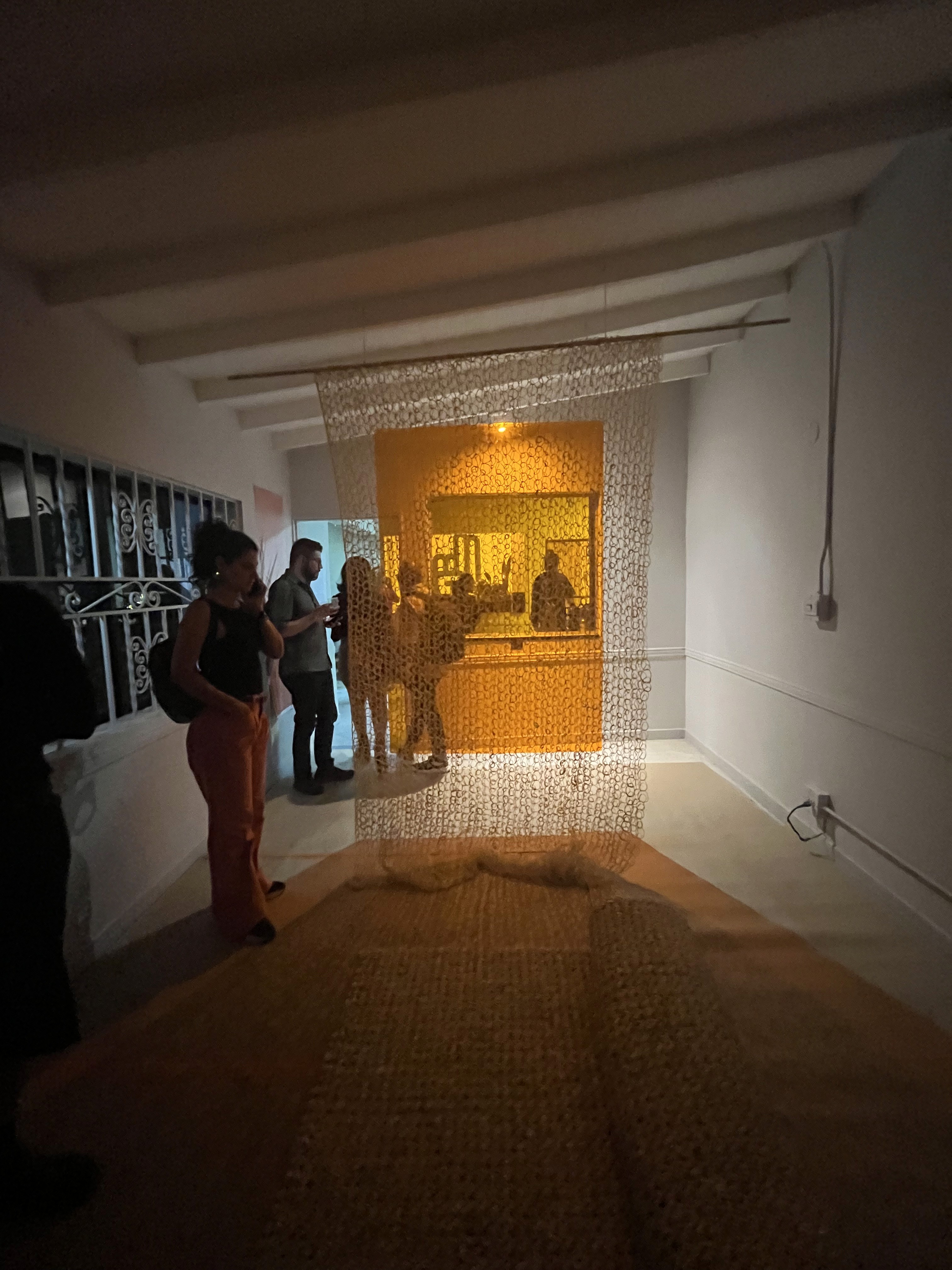 Esta instalación fue mi intento de volver a esa ausencia. No para reconstruir el objeto, sino para aproximarme a su sensación. El fique es áspero, amarillo pálido, como arena seca. Trabajando con distintos espesores y densidades, e incorporando elementos acrílicos y lumínicos que intensifican y refractan su color, construí capas translúcidas que filtran la luz y producen profundidad en el espacio. La instalación funciona como una arquitectura porosa: un espacio que respira, filtra la luz y sostiene el cuerpo sin más mobiliario que la fibra. Al pasar tanto tiempo en el estudio pude vivir la instalación como espacio cotidiano y compartir la experiencia con un pequeño público durante una noche de puertas abiertas en los estudios de artistas de Barrio Colombia.